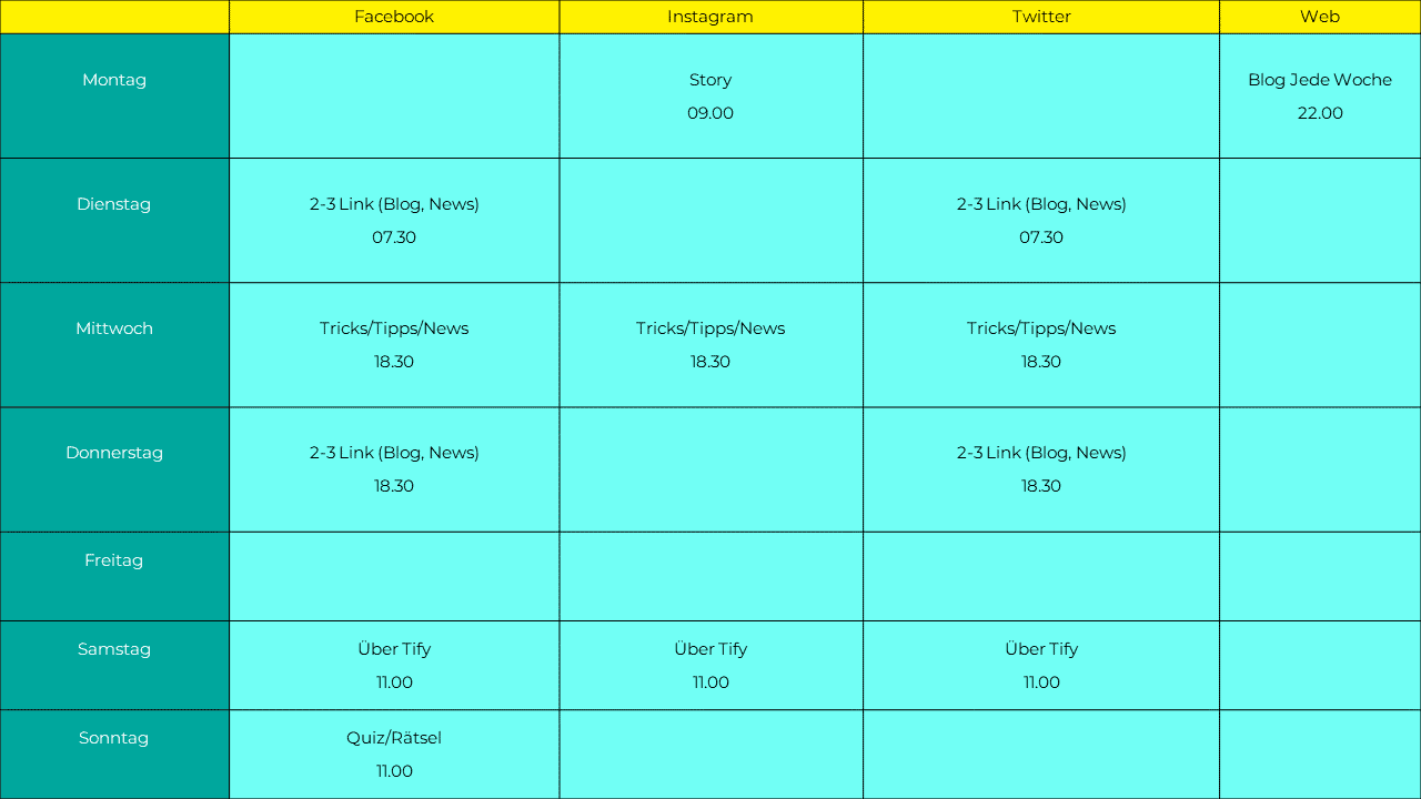 Der Hauptwitz bei jeder Socialmedia-Plattform ist, dass Sie dort regelmäßige und kreative Inhalte posten müssen. Das ist das A und O des Erfolgs auf Socialmedia. Jeder Follower*innen einer Socialmedia Plattform erwartet zu Recht, dass die geposteten Inhalte ihnen einen Mehrwert ausliefern. D.h. erwarten sie von den Inhalten, dass Sie sie informieren, updaten, amüsieren, anregen und ansprechen. Socialmedia-Plattformen sind leider keine Postfiliale, wo man nur eigene Nachricht abschickt. Sie müssen mehr leisten, als einen Brief zu verfassen und ihn abzuschicken. Sie müssen Ihre Socialmedia Plattform sozialer managen und einen effektiven Redaktionsplan erstellen. Ein Redaktionsplan hilft Ihnen dabei, was und wann Sie regelmäßig posten müssen. Die Einhaltung des Plans ist enorm wichtig um Ihre Sichtbarkeit und Reichweite zu erhöhen. Hierfür haben wir einen Musterredaktionsplan für Sie erstellt wann und was wir als tify posten.